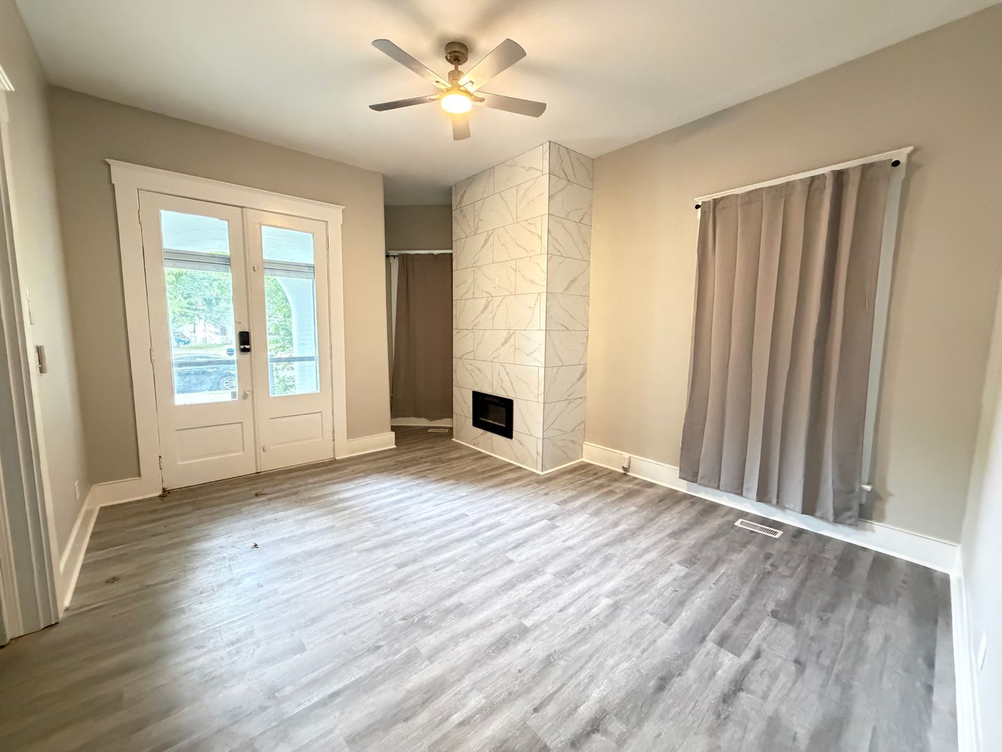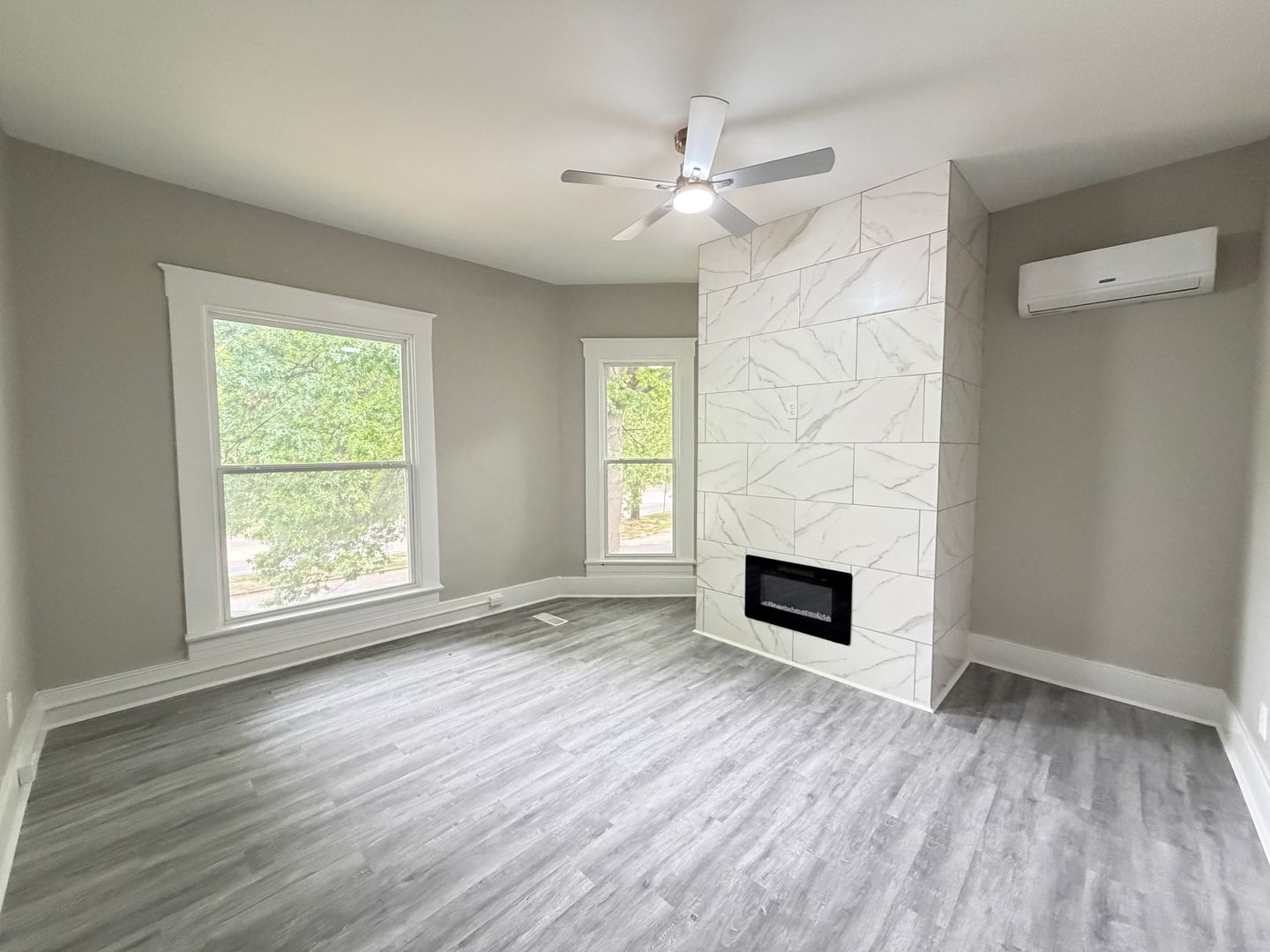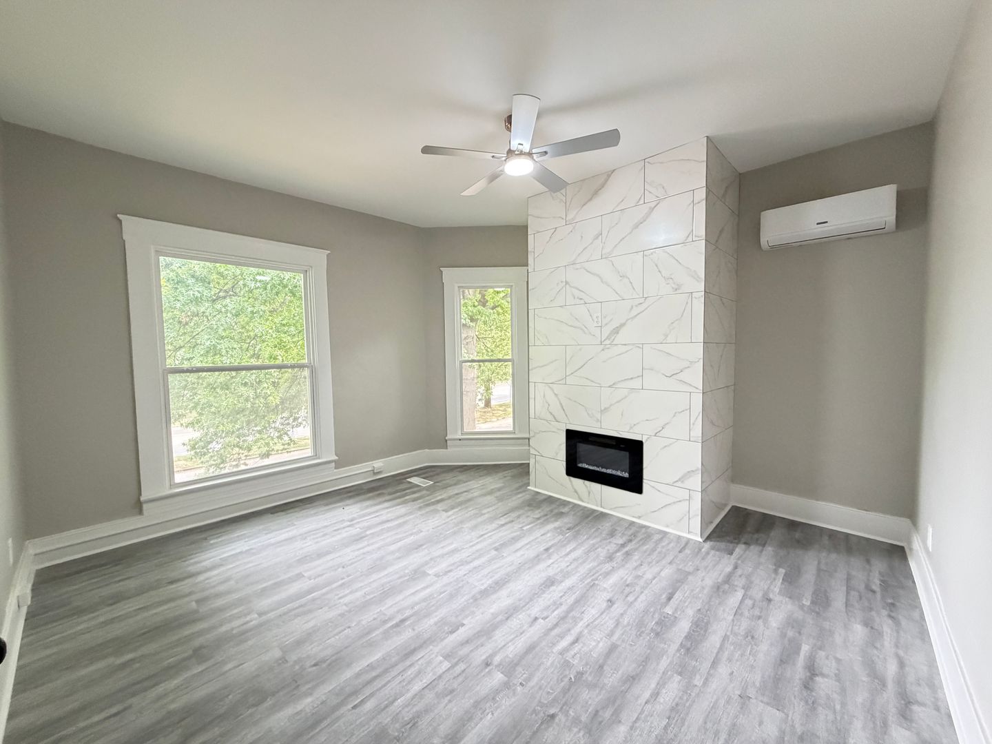 The second-floor master bedroom includes a private balcony, perfect for relaxing and enjoying fresh air. Every room is designed with large windows that bring in plenty of natural light, creating a bright and inviting atmosphere, and each space is accented with its own fireplace display to add warmth and charm.